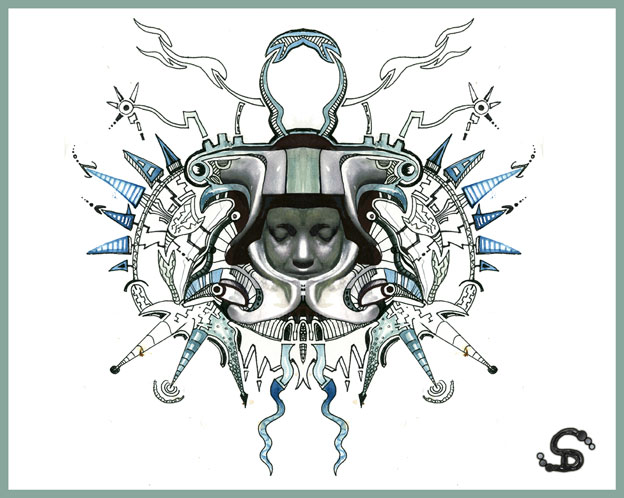 His paintings and drawings are convoluted, indulgent and prosaic.  The first drawing I stared at was Consciousness (2010).  I didn’t look. I gawped. Grasping the monitor in my hands.  I was curious as to where this image was conceived from. The drawing portrays a robot type figure reminiscent of the work of Dutch graphic artist M.C. Escher.  Here this robot-like-figure spews a cacophony of odd shapes, arrows, eye balls and what looks like Aztec gold from mechanically controlled tentacles attached to its brain.  Its as if this drawing is looking for a way out while you’re looking for a way in.  I bit my tongue and it bled for a bit. I can only compare it to a pleasant frustration.  Like attempting to complete The Times crossword. His paintings are the more pleasantly grotesque and colorful of his work.  Like a rainbow taken apart by a bazooka.